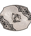 This medium sized scallop shape belt buckle features opposite corner flourishes of open filigree curls in an elegant paisley shape bringing to mind the lightest puff of a gentle breeze. A striking, sculpted figure of a cowboy surveying the road ahead with his horse waiting at hand is applied to the center of the silver plate elegantly engraved in traditional Western bright cut style swirls. A trim of antiqued silver pinpoint etching frames the edge. Standard 1.5" belt swivel.
