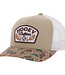 A clean, classic trucker with a western edge. This Hooey Outfitters cap features a structured tan front, camo bill, and breathable white mesh back, finished with a bold embroidered patch—perfect for everyday wear from the ranch to the road.