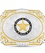 This rectangular shaped buckle with cut corners makes a striking and bold accent. Framed with a wire trim and a set of beads on each edge, gold-tone filigree fills each corner around the oval center etched in traditional Western style bright cut engraving. Gold tone twisted rope frames the center sculpted figure of a two tone star with deep black for depth and contrast. Standard 1.5 inch belt swivel.