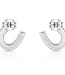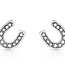 A set of small upturned silver horseshoes, encrusted with clear rhinestones and dangling from a fine link silver chain. Earrings measure under 1/2 inch long.