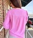 Tie front blouse 3 adjustable front spaghetti tie detail Fully closed front V-neck 3/4" sleeve with elastic in opening Box pleat detail on back Shirring detail along shoulders Solid woven air flow fabric