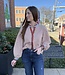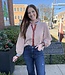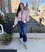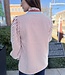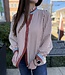 Long sleeves button down stripe top, ruffled neckline, solid contrast binding accent, buttons on the wrist cuffs.