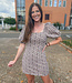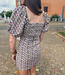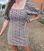 This floral mini dress features a structured square neckline and exaggerated puff sleeves with elasticized cuffs, complemented by vertical seaming for shape and a smocked back panel for a flexible, flattering fit. Model is 5'6" and wearing a small.