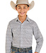 A boys’ long sleeve western button-up featuring a classic black and white geometric print. Designed with traditional western details, pearl-style snaps, and a comfortable fit, this shirt is perfect for school, special occasions, or everyday western wear.