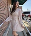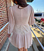 Pleated chiffon long sleeve mini dress with geometric crochet panels, scalloped lace neckline, and soft waist tie for shape
