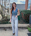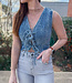 V NECKLINE SLEEVELESS CROPPED FRONT DOUBLE TIE DETAIL FLORAL WASHED DENIM PATTERN (TONES MAY VARY) NOT LINED DENIM VEST 75% COTTON 25% POLYESTER