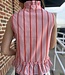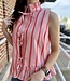regular size, standard, young contemporary, contemporary, stripe pattern, blouse, shirt, top, peplum look, self tie closure in the front, sleeveless, split neck, ruffle trim neck, cute, stylish,