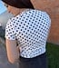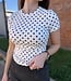 The design highlights a structured crew neckline and fitted short sleeves that frame the upper body. Cut in a body-skimming silhouette, it offers comfort and stretch