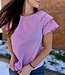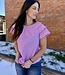 Layered short raglan sleeves stripe top, embroidered scallop edge layered sleeve detail, button closure back.