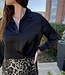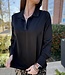 This sleek satin blouse features a fluid, pull on design with a notched collared neckline, long sleeves with button cuffs, a curved high-low hem with side slits, and a relaxed drape for an effortlessly elevated day to night look.