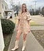 - Shirring Detail Printed Woven Mini Dress - Button Down - Short Flyaway Sleeve - V-Neck - W/ Lining