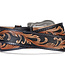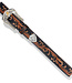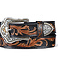 The beauty of this tooled belt is in the hand-antiqued black and tan colors that bring out its rich textural pattern. A silver- and gold-plated two-piece buckle set echoes the design on the strap.